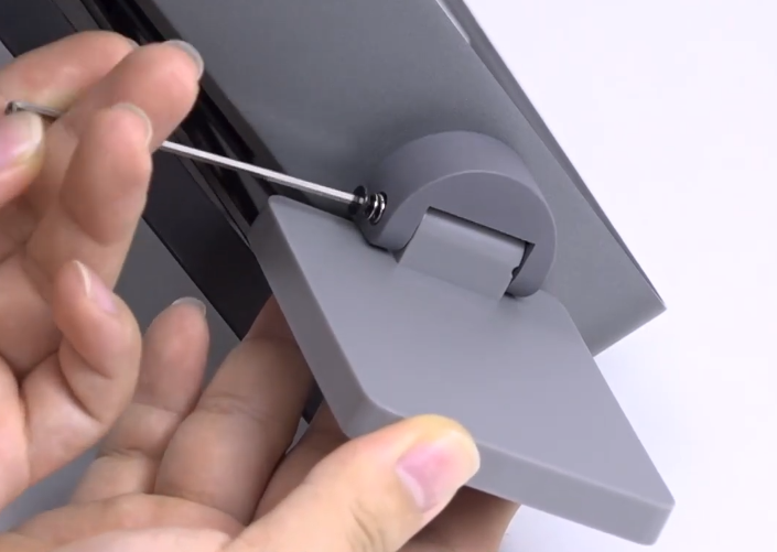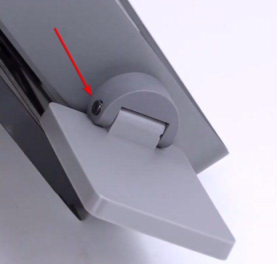 Flip the machine to a standing position and remove the screw securing the screen to its mount. Position the machine in a standing position. Use your 2mm Hex Driver to remove the screw that secures the screen to its mount.