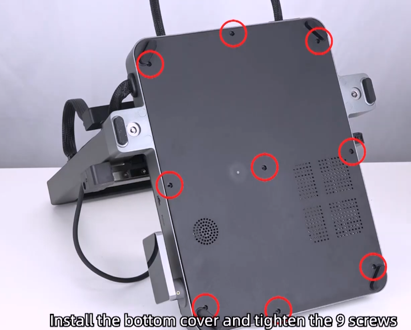 Reattach the bottom panel by aligning it with the chassis. Use your 2mm Hex Driver to fasten the nine screws, ensuring they are properly tightened.